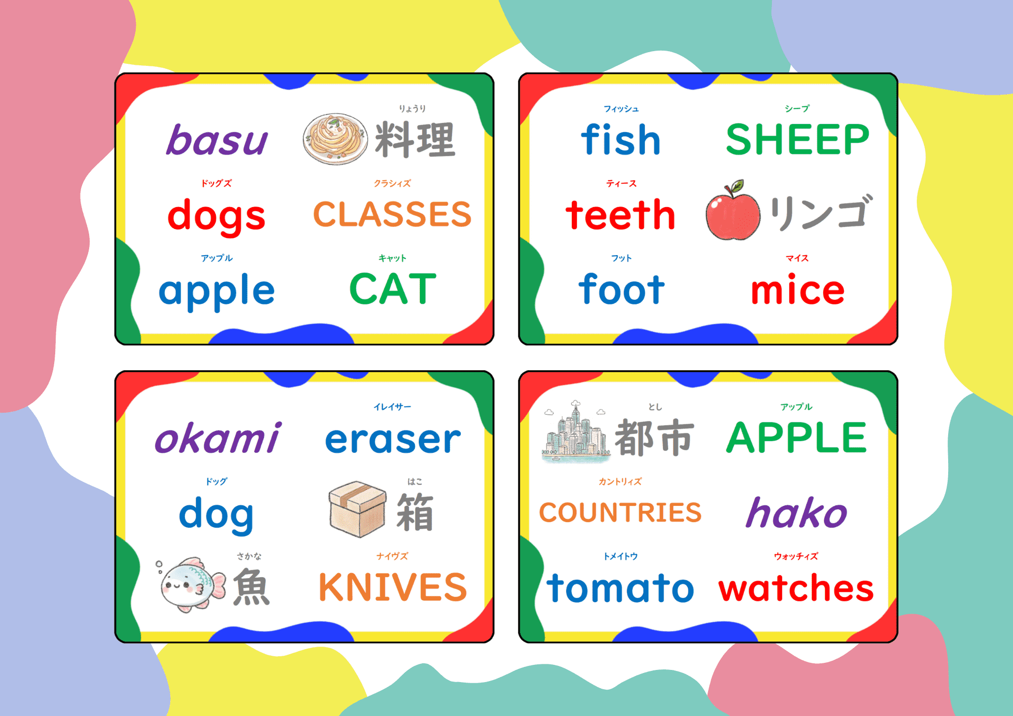ゲームを通じて、英単語・単数形と複数形・動詞の活用などを学べます!